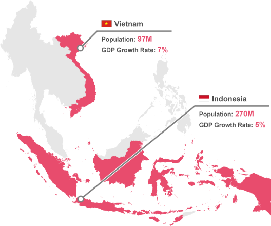 近年、東南アジア諸国の中でも特に成長著しいベトナム、インドネシア市場への注目が高まっています。既存のビジネスが成長していく一方、商品やサービスが充実しているとは言いがたく、大きなビジネスチャンスが眠っていると言えます。国内需要の縮小が懸念される今、新たな市場への進出をご検討ください!
