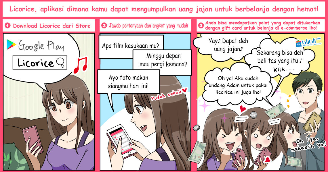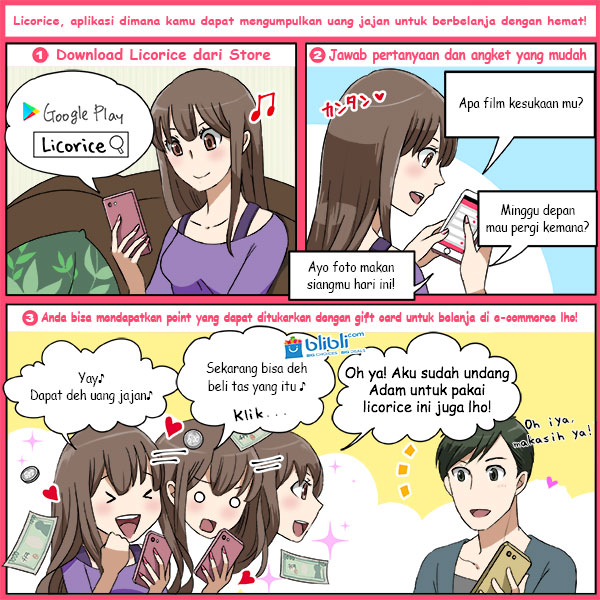 Licorice merupakan aplikasi smartphone yang menghubungkan bisnis dan target marketnya dengan cara mengirimkan pekerjaan (survey,dll). User yang telah mengerjakan pekerjaannya akan mendapatkan poin yang dapat ditukarkan dengan gift card marketplace ternama di Indonesia seperti Tokopedia dan Blibli.com.